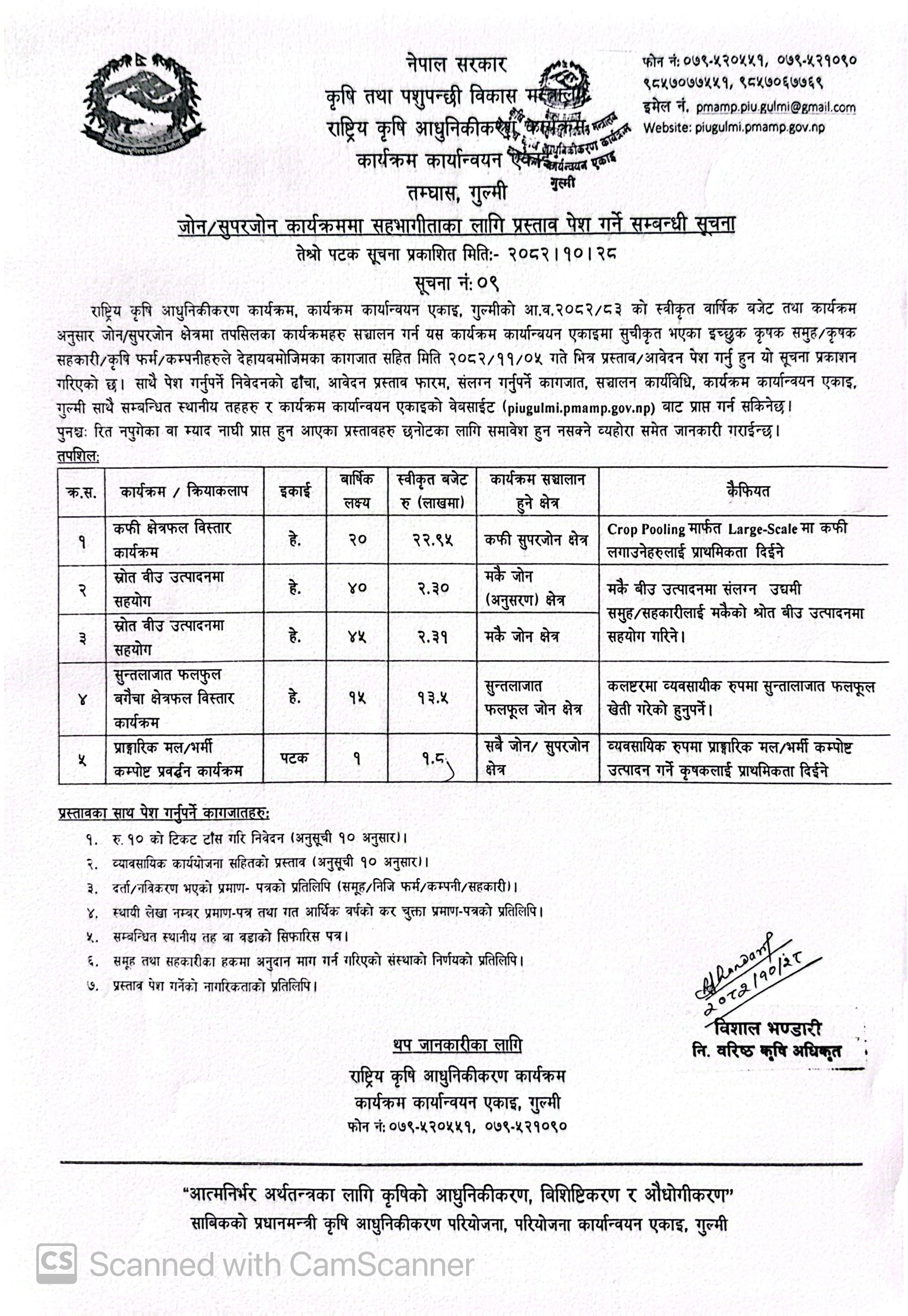 कार्यक्रम संचालित क्षेत्र: रेसुङ्गा न.पा.-१०,११,१४ मुसीकोट न.पा.-२,६ मालीका गा.पा.-६,७,८ मदाने गा.पा.-२,३ इश्मा-१,३,४,५,६ चन्द्रकोट गा.पा.-६,७,८ सत्यवती गा.पा.-१,२,३,४,५,६,७ कालीगण्डकी गा.पा.-१,3,4,५, छत्रकोट गा.पा.-१,३,४,५,६ रुरुक्षेत्र गा.पा.-१,२,३,४,५,६ गुल्मीदरवार गा.पा.-३,५,६,